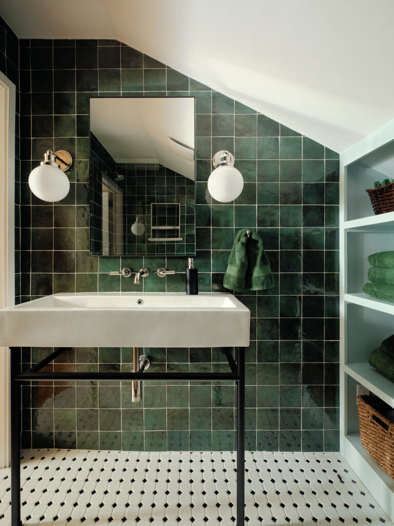 With this bathroom, it met at an angle. We wanted to enhance that to give it character and make it bold. These green tiles really capture exactly what we were going for! Tiling the wall and shower give a sense of cohesiveness while keeping it fun and moody!