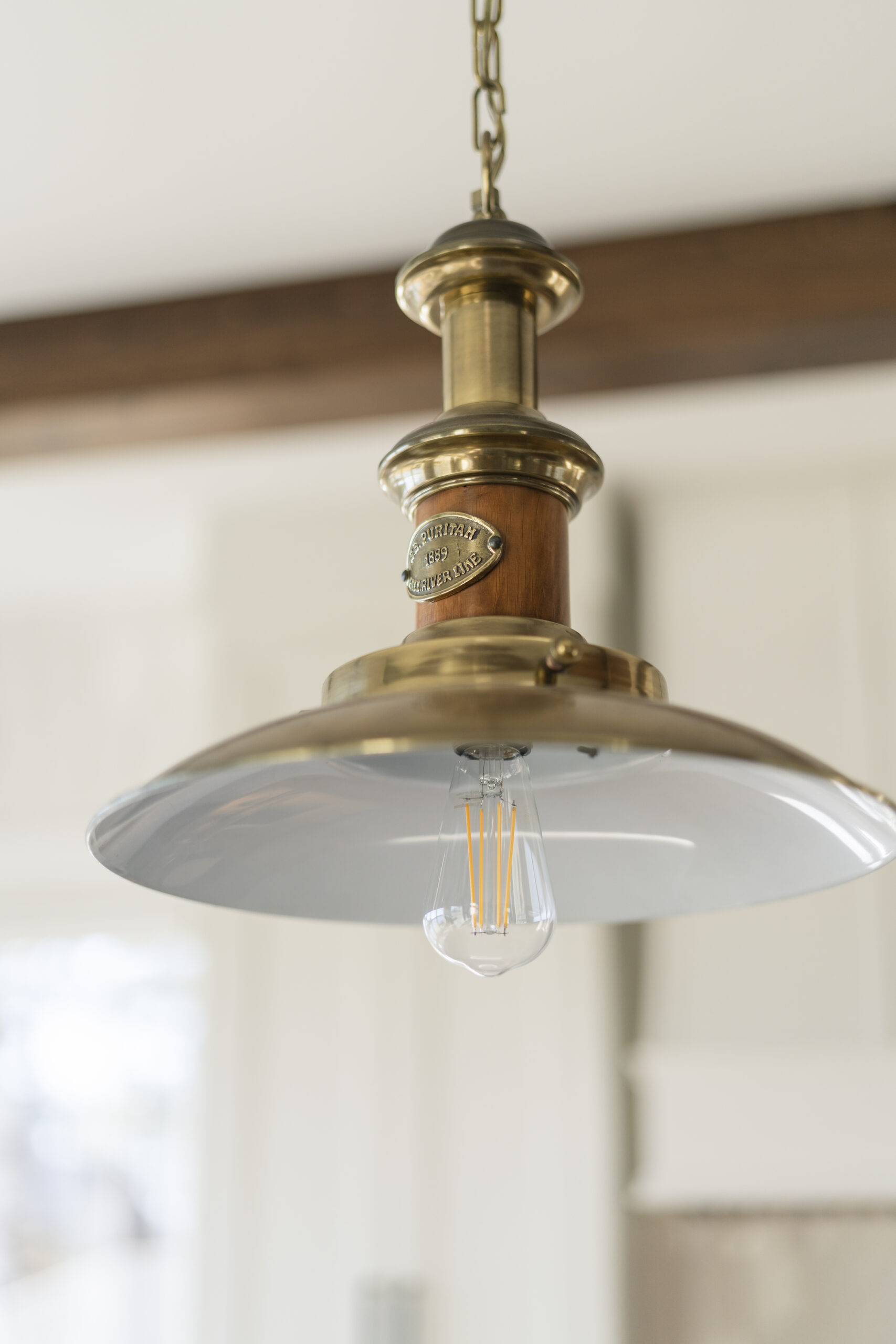 These brass S.S. Puritan 1989 Fall River Line pendants gave the Lake Martin room so much character, and the history behind them is also worth reading about. They not only added a rustic touch, but also drew in a nautical feel to the whole room, which was essential in the home renovation service.